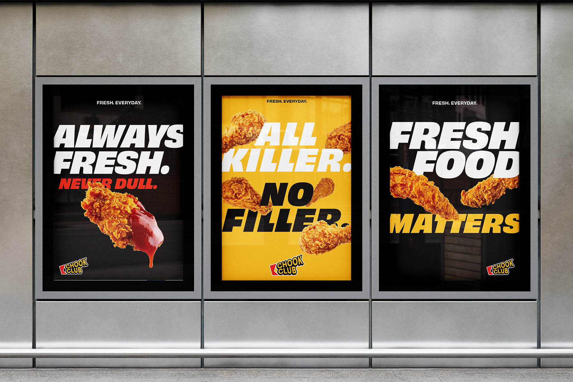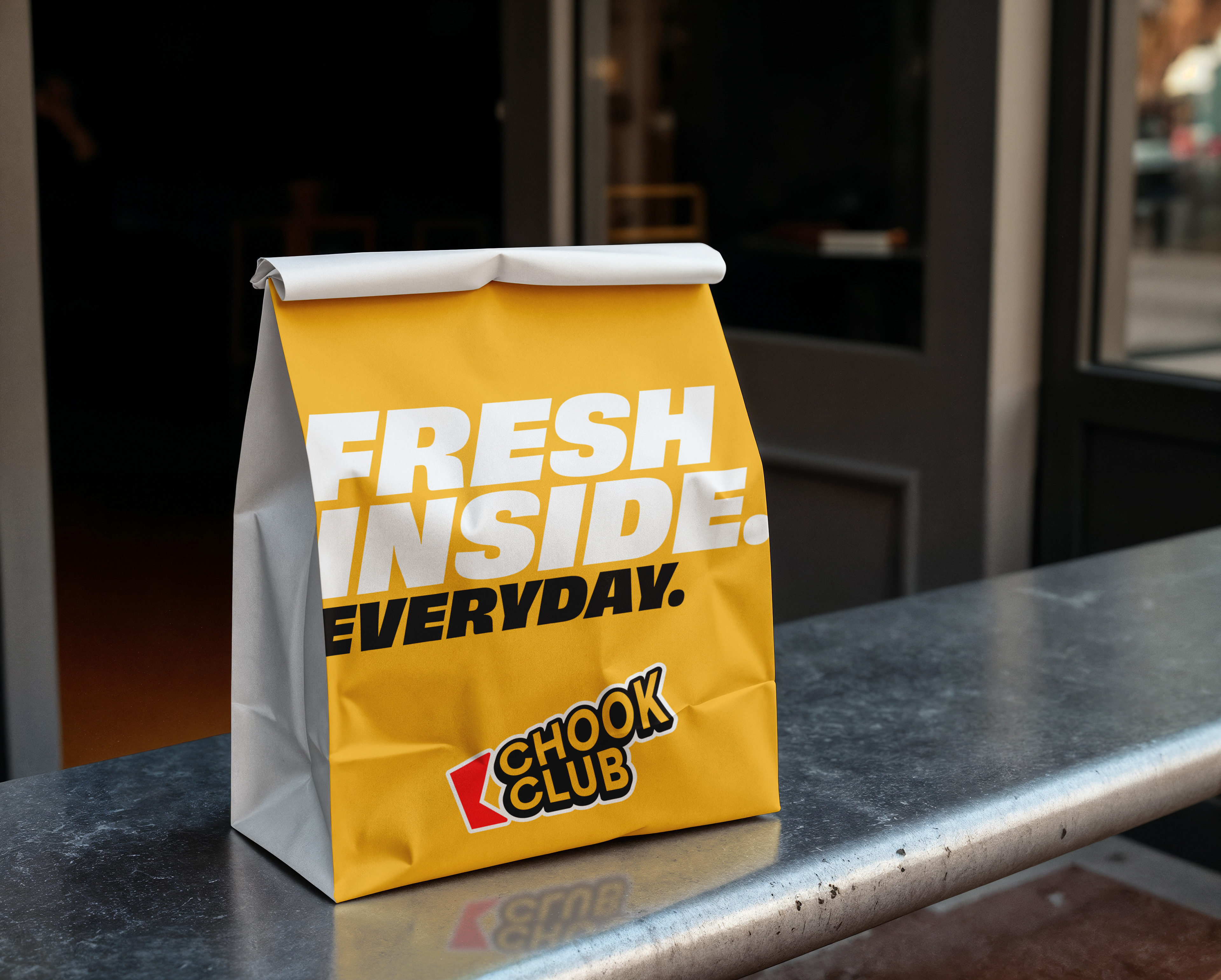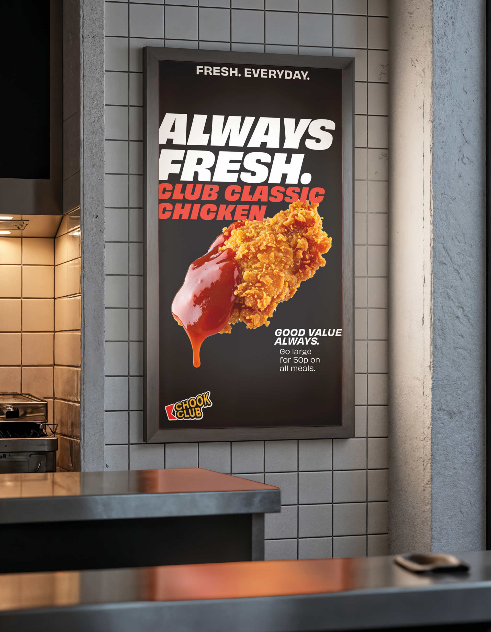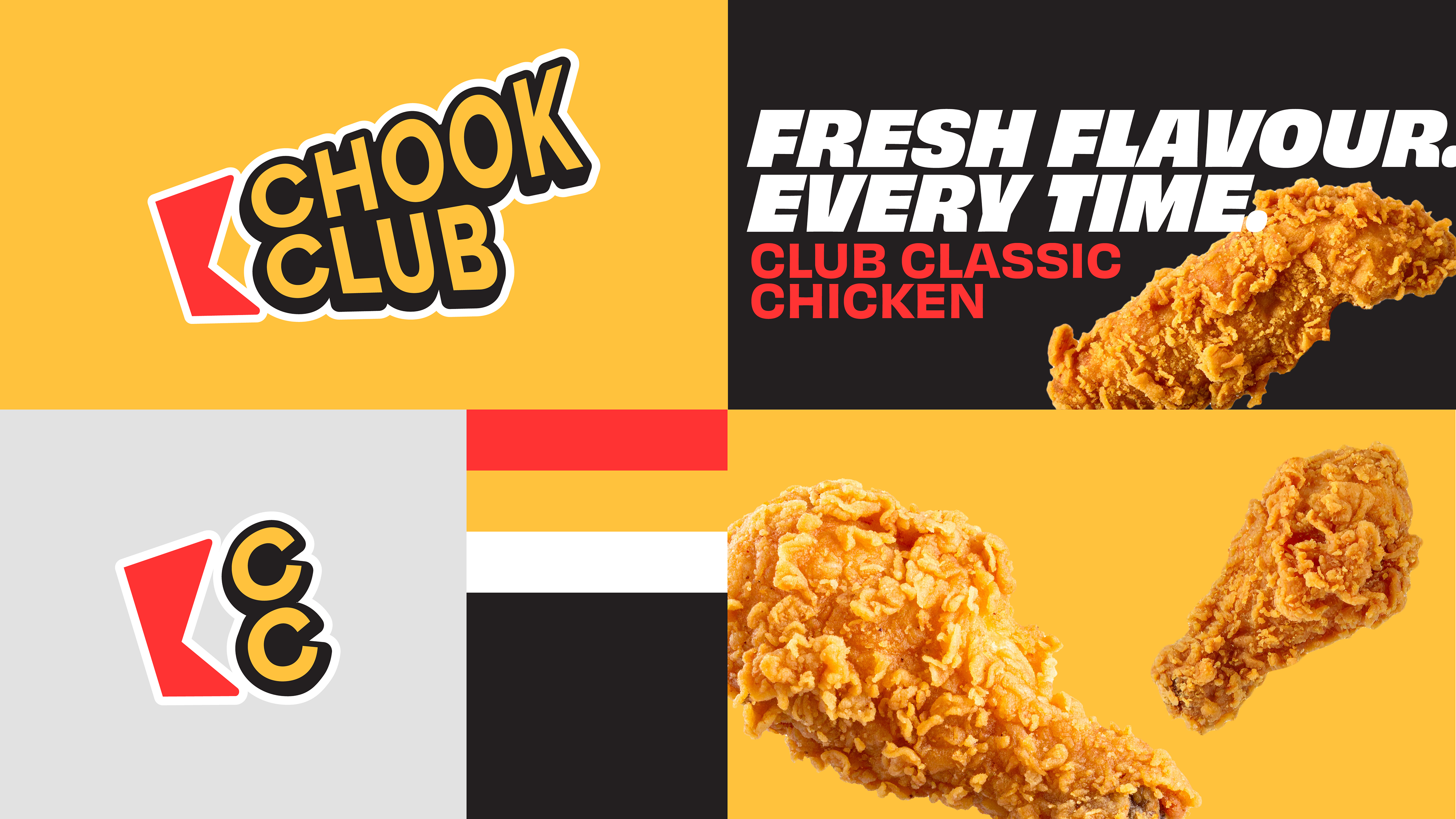 Chook Club is a rebrand of a long standing British fried chicken chain, designed to connect with a younger audience. The new name and identity bring high energy and big attitude to make a statement as loud as the flavours.